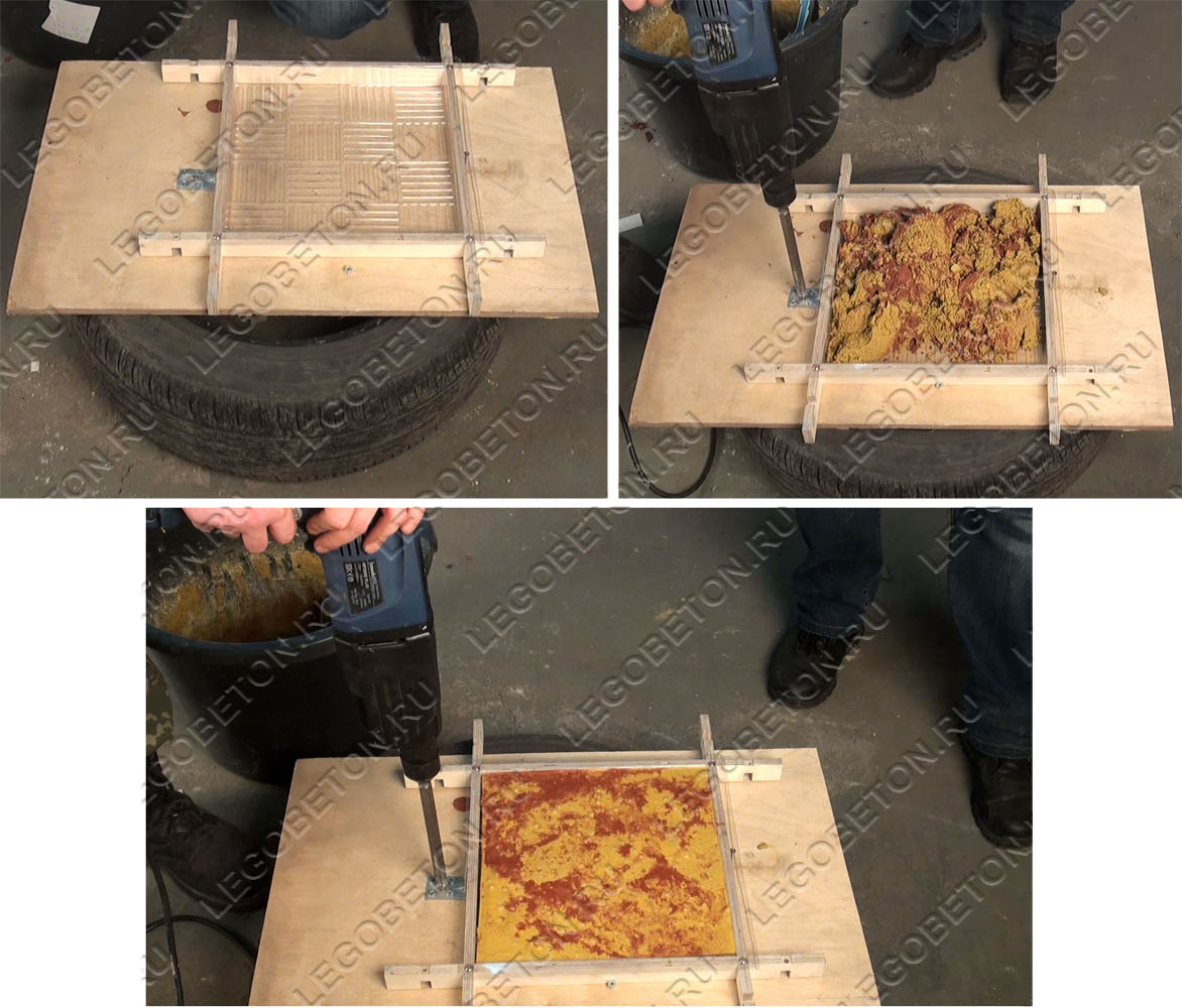 Если нет вибростола и вы не хотите тратить деньги на его приобретение или изготовление, вы можете за 5 минут сделать импровизированный вибростол с помощью старой автомобильной шины, листа фанеры 12-15 мм и дрели работающей в режиме перфоратора (без вращения).