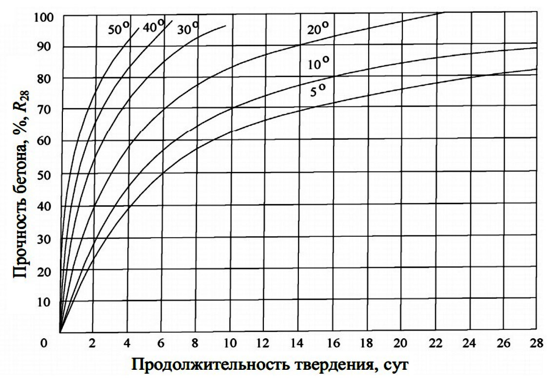 Приведенный график отображает усредненный процесс набора прочности бетоном в зависимости от температуры. Фактические значения зависят от кол-ва цемента в бетоне, его марки, пластификаторов и ускоряющих добавок (могут также входить в состав пластификаторов).