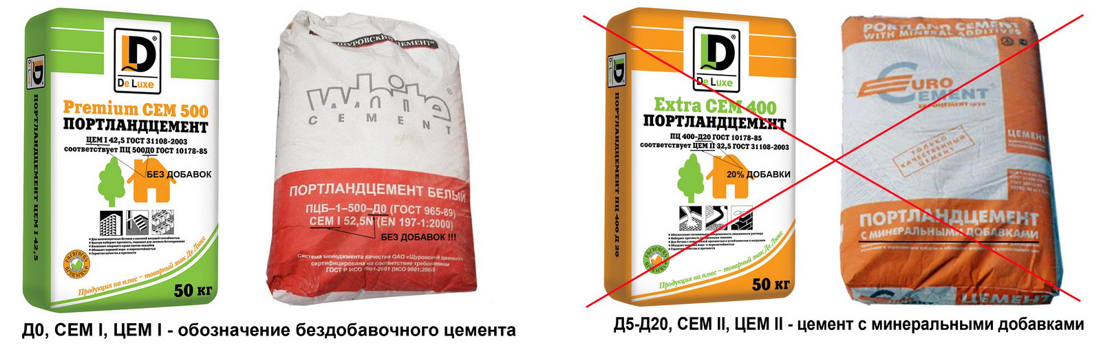 - обозначения максимального содержания добавок в портландцементе: Д0, Д5, Д20;