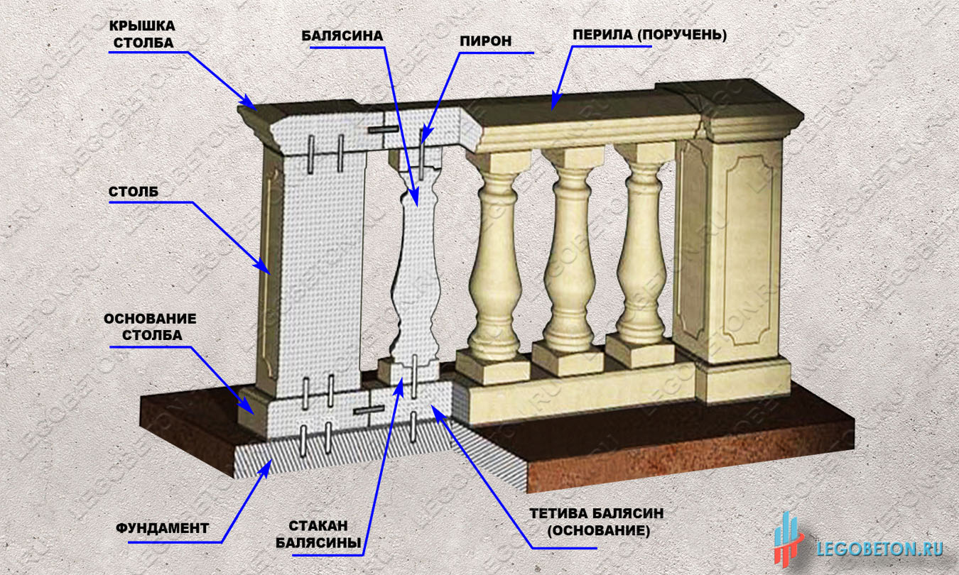 Бетонная балюстрада — это набор архитектурных элементов для ограждения лестницы изготовленный методом вибролитья в пластиковые формы. Что входит в состав основных элементов балюстрады :