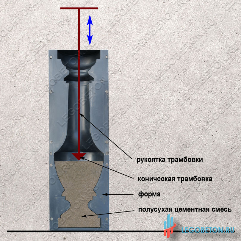 Подготовленная смесь засыпается в форму порциями-слоями толщиной 50-70 мм. Далее засыпанная смесь уплотняется трамбовкой. Это может быть труба, на конец которой крепится конусообразная трамбовка с диаметром немного меньшим чем самое узкое место формы. Желательно использовать именно конусообразную, а не плоскую, так как она намного лучше уплотняет раствор.