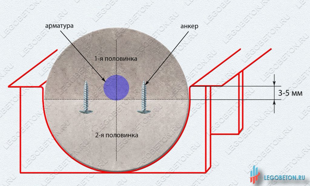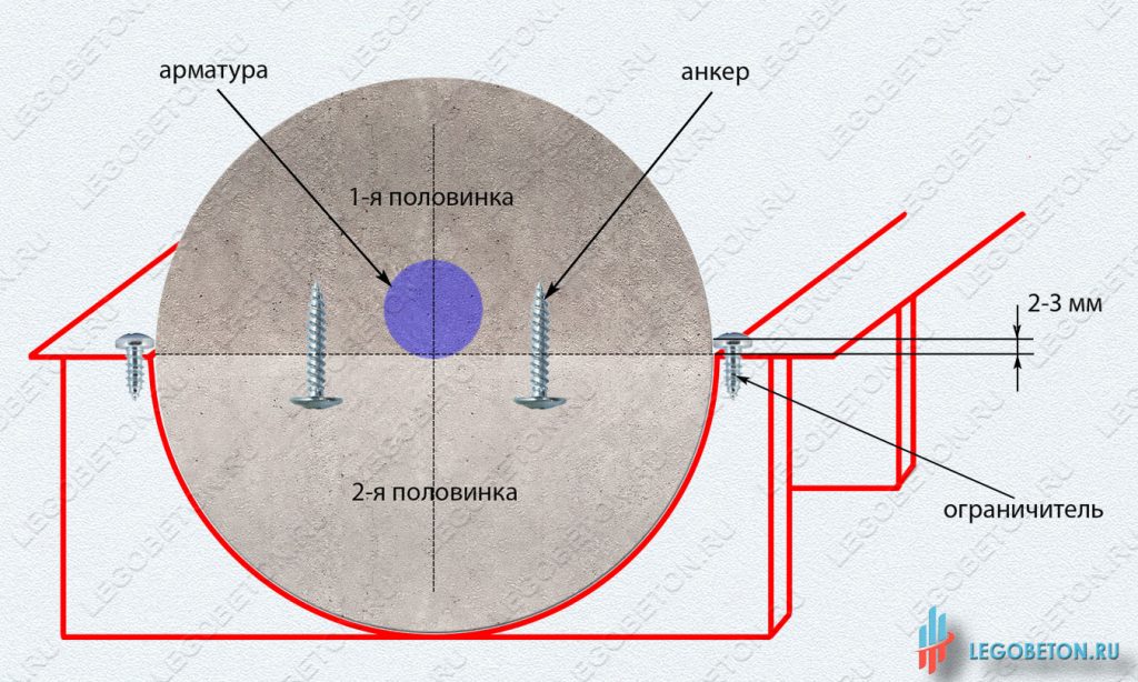 При установке ограничителей (шурупов) важно чтобы край ограничителя совпадал с краем формы и выступал не более чем на 2-3 мм. Этой высоты достаточно для фиксации после осаживания верхней половинки.