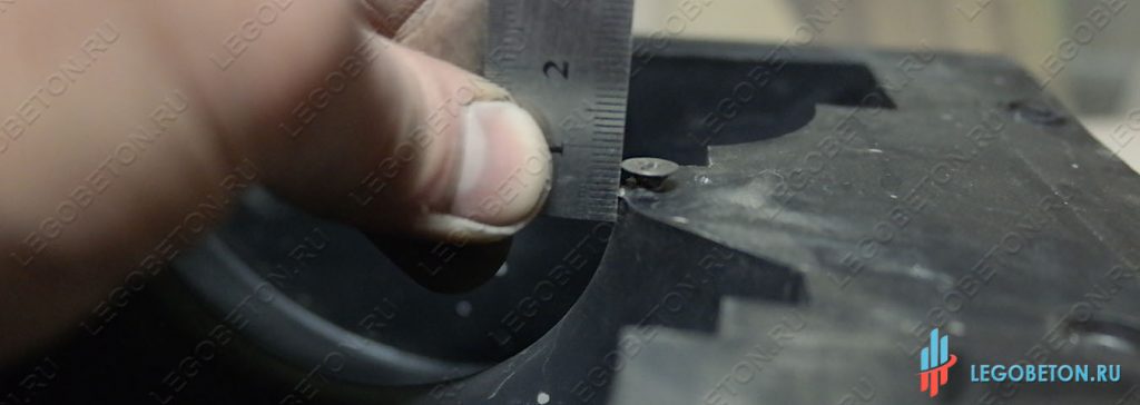 Производим заливку раствора (уровень смеси после виброуплотнения должен быть ниже верхней кромки формы на 3-4 мм). Величина этого зазора для различных форм может меняться, но обычно находится в диапазоне 3-5 мм.