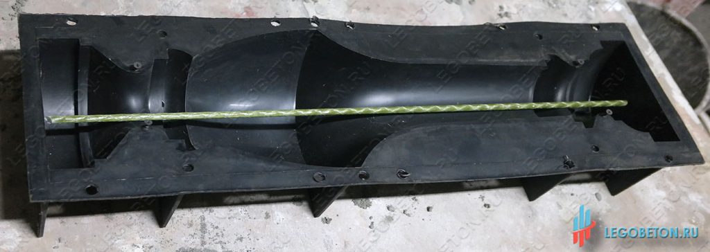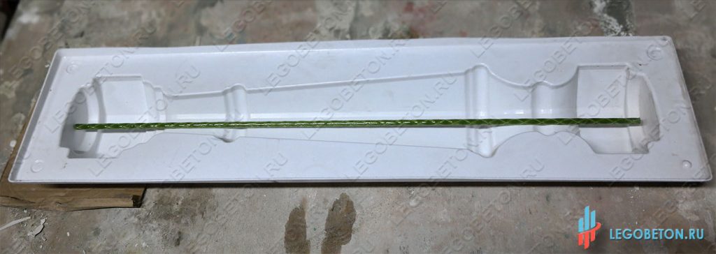 Для увеличения прочности первой половинки, помещаем в форму стеклопластиковую или металлическую арматуру. Для фиксации положения арматуры можно использовать проволоку или фиксатор арматуры типа “звездочка” или “кольцо”