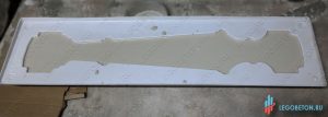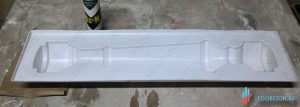 - Форму с находящимся внутри изделием-вкладышем поворачиваем тыльной стороной вверх и накрываем стрейч-пленкой с целью защиты поверхности от контакта с монтажной пеной. Это позволит многократно использовать опалубку заменяя только форму-вкладыш (из АБС или УПП). Также упрощается процесс распалубки готового изделия.