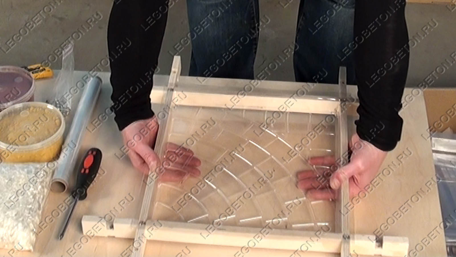 После трамбовки вы можете перенести заполненную раствором форму на ровную поверхность для первичного созревания. Формы с гибким вкладышем нужно переносить поддерживая заполненый вкладыш снизу пальцами, как показано на фото.