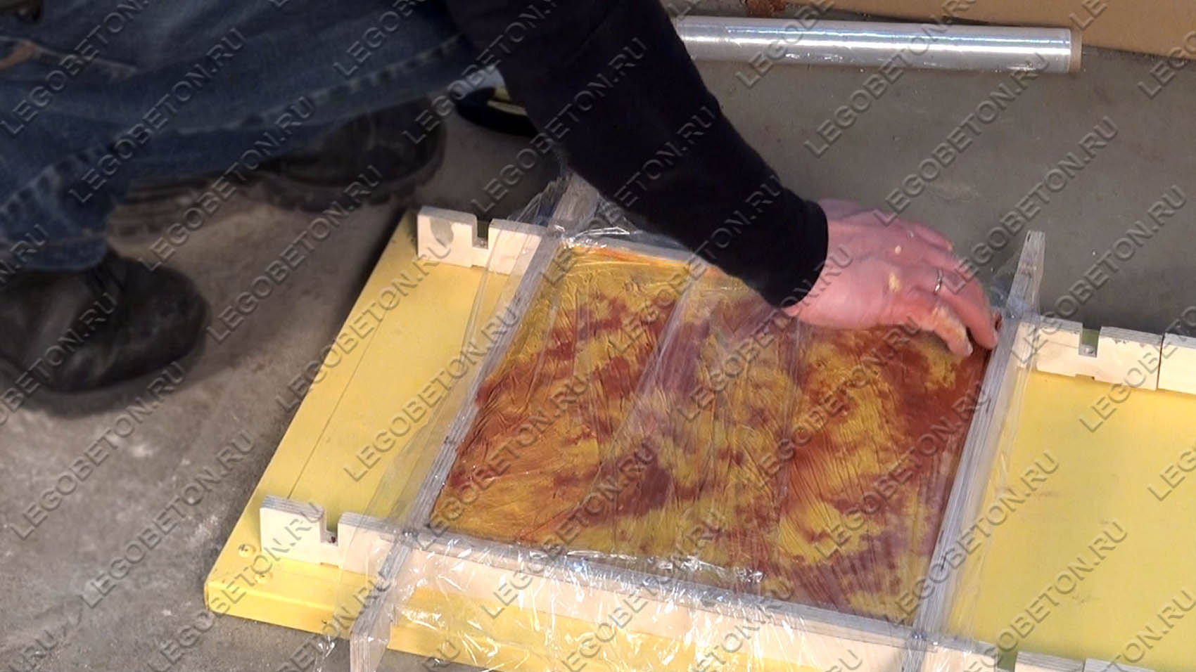 Поэтому очень важно с помощью входящей в комплект пленки тщательно закрыть готовую плитку. Оптимальным является накладывание 2-х слоев пленки с «приклеиванием» ее к поверхности готового изделия. Затем при расформовке эта пленка легко снимается, не оставляя следов.